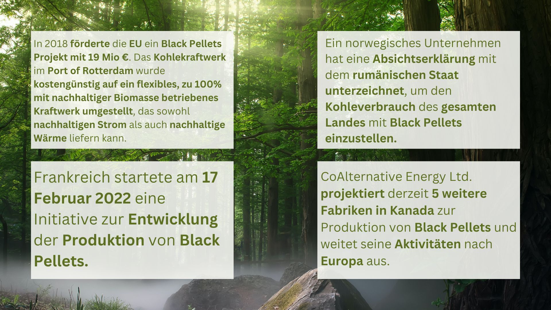 ... baut ein "Black Pellets" Werk in Meadows County (Alberta), die bis zum dritten Quartal 2025 betriebsbereit sein wird und 360.000 Tonnen CAE Green Energy Pellets pro Jahr erzeugen soll. Die gesamte Produktion ist an Idemitsu verkauft. Diese Menge reicht aus, um 750.000 Haushalte mit sauberer Energie zu versorgen.